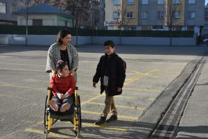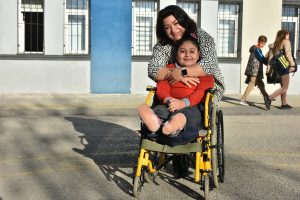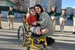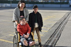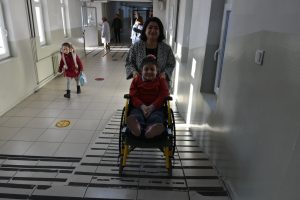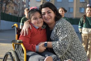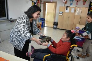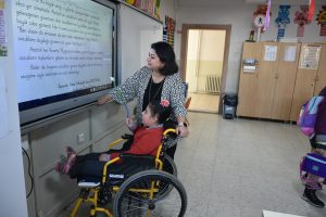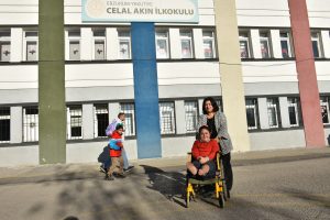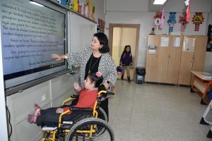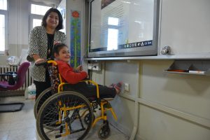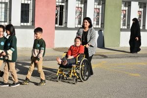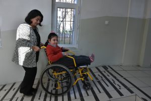 Canan öğretmen, tekerlekli sandalye ile okula gelen Zehra’yı kendi elleriyle okul içinde taşıyor. Her türlü ihtiyaçlarını gidermek için kendisine yardımcı oluyor.