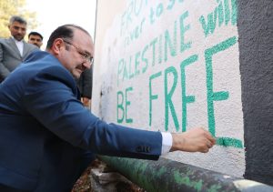 AK Parti Erzurum İl Başkanı Av. İbrahim Küçükoğlu da, Rektör Hacımüftüoğlu ile birlikte duvara yazı yazarak, “Nehirden Denize Filistin Özgür Olacak” dedi.