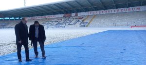 Gençlik ve Spor İl Müdürlüğü, çetin kış şartlarının hüküm sürdüğü Erzurum’da Kazım Karabekir Stadı’nın zemini korumak için yoğun çaba sarf ediyor. İl Müdürü Levent Çakmur da, hemen hemen her sabah stada giderek zemin koruma çalışmalarını yakından takip ediyor.