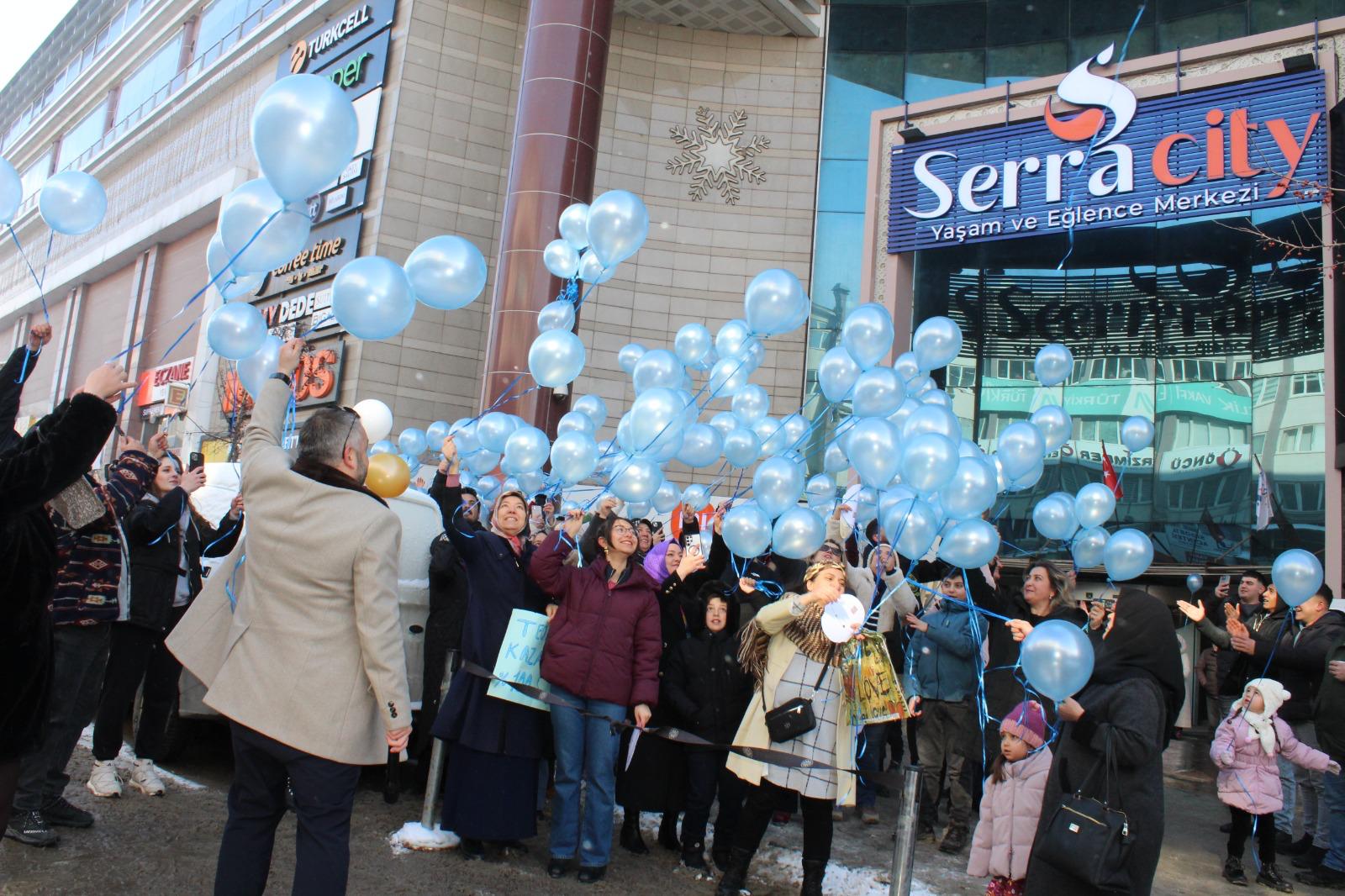 Yapılan konuşmaların ardından binlerce mavi renkte balon, alkışlar eşliğinde Aydın ve Erzurum’da gökyüzüne bırakıldı.