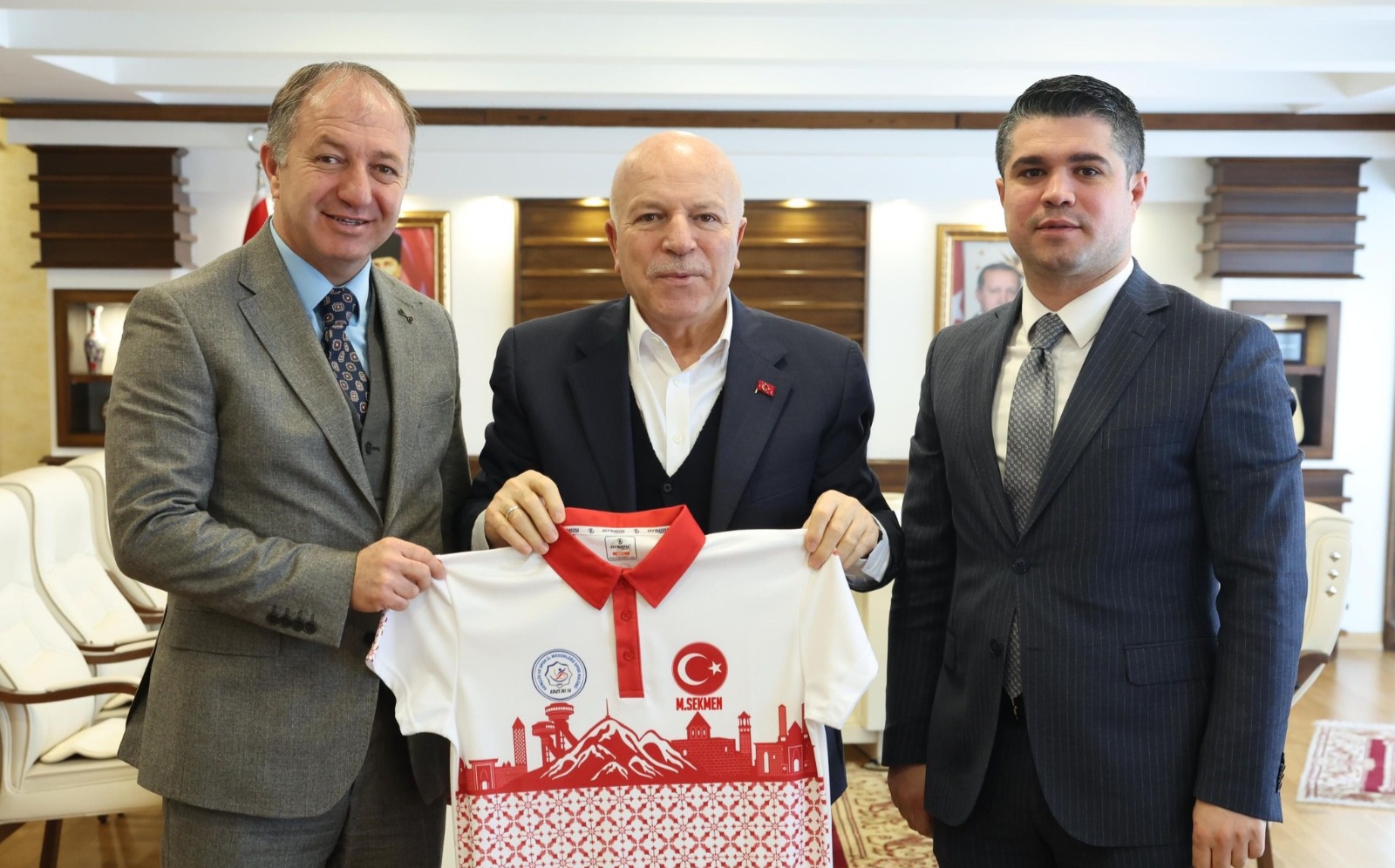Erzurum Gençlik ve Spor İl Müdürü Levent Çakmur ile Spor Hizmetleri Müdürü Erdoğan Dönmez, Büyükşehir Belediye Başkanı Mehmet Sekmen’i ziyaret ederek, kendisine Erzurum Temalı Forma hediye ettiler.