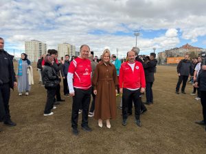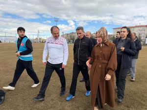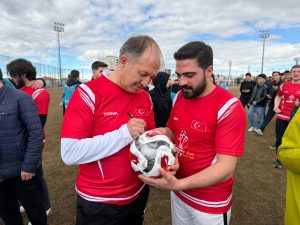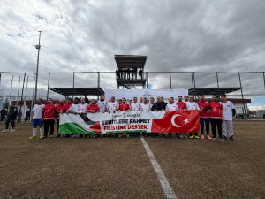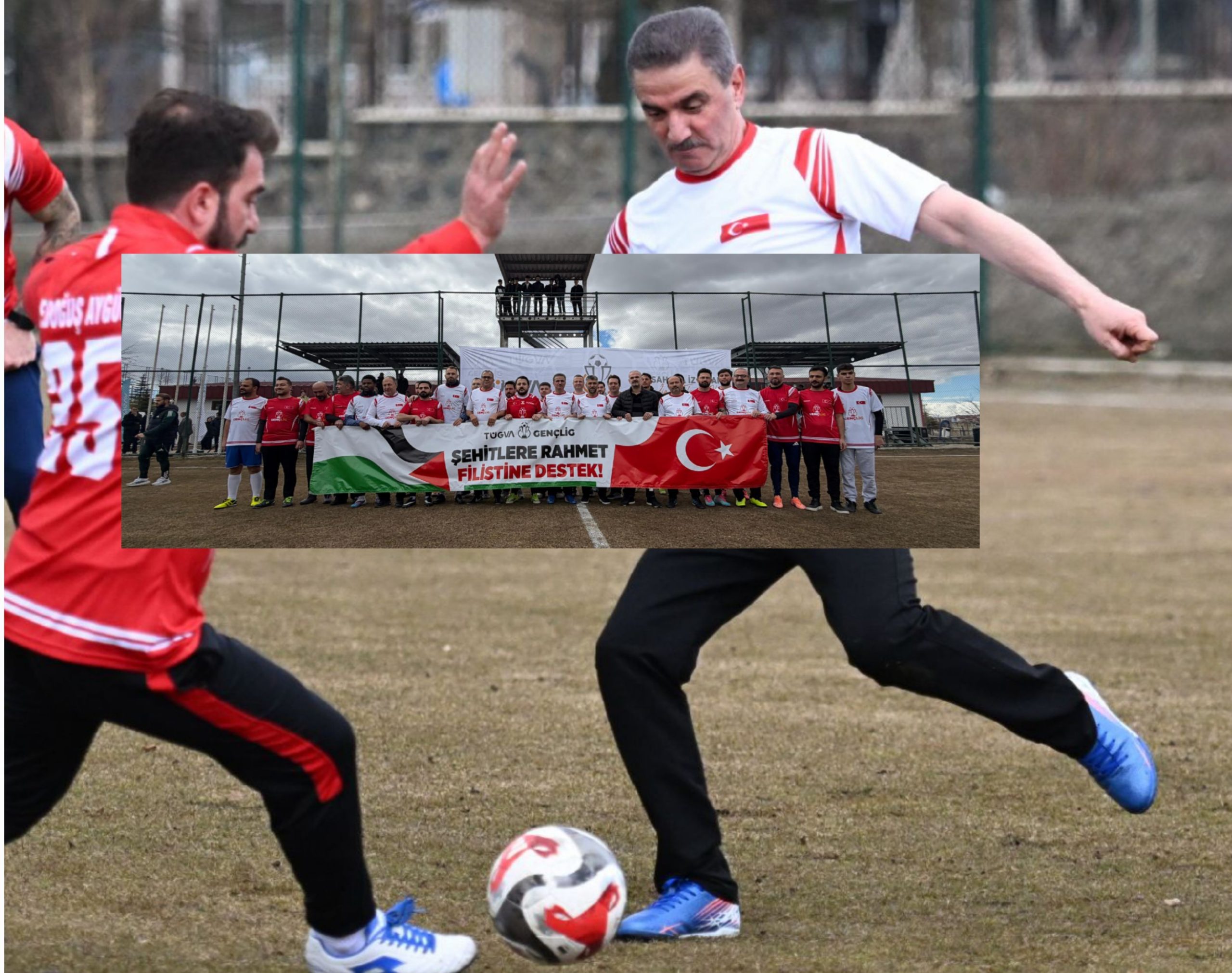 TÜGVA Erzurum İl Temsilciliği tarafından düzenlenen ‘GençLig Futbol Turnuvası’nın Erzurum’daki ilk maçında,Vali Aydın Baruş,il protokolü Erzurumsporlu futbolcular ve lise öğrencileri karşılaştı. Katılımcılar maça Filistin’e destek pankartıyla çıktı.