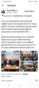 Milli Eğitim Bakanı Prof. Dr. Yusuf Tekin, EGC ziyaretini sosyal medya hesaplarından paylaştı. Bakan Tekin, “Bugün Erzurum Gazeteciler Cemiyeti’nde değerli basın mensuplarımızla bir araya geldik. Cemiyet üyeleriyle bayramlaştık. İlimiz özelinde gerçekleştirdiğimiz çalışmalara dair hasbihal ettik. Nazik konukseverliği için Cemiyet Başkanımız Mehmet Musa Çakır’a teşekkür ediyorum. Tüm değerli gazetecilerimizin Ramazan Bayramını en içten dileklerimle tebrik ediyorum.” İfadelerine yer verdi.