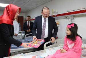 Ziyaret sırasında hastaların ve ailelerinin bayramını kutlayan Hacımüftüoğlu çiftine, Rektör Danışmanı Dr. Yasin Sepil, hastane yönetimi ve sağlık personeli de eşlik etti.