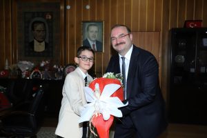 Gazi Mustafa Kemal Atatürk’ün çocuklara armağan ettiği bu özel günde, temsili devir teslim töreni çerçevesinde, Atatürk Üniversitesi Rektörü Prof. Dr. Ahmet Hacımüftüoğlu koltuğunu bir günlüğüne Vakıf Okulları 5. sınıf öğrencisi Ahmet Enes Sağlam’a devretti.