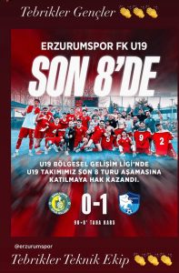 Erzurumspor profesyonel takımı Süper Ligi kovalıyor. U17’den sonra U19 takım da Türkiye’de son 8’e kalma başarısı gösterdi. Alpaslan Topçu yönetimindeki U19’lar Şanlıurfa engelini aşıp Türkiye şampiyonluğu hedefini devam ettirdi. Amed Spor’u geçen U17’lerde çeyrek final bileti almıştı. Futbol İl Temsilcisi Ferit Karakoca’dan Mavi-beyazlılara kutlama geldi.