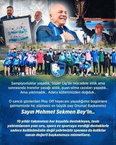 Yapılan paylaşımda: “Şampiyonluklar yaşadık. Süper Ligde mücadele ettik ama sonrasında transfer yasağı aldık. Puan silme cezaları yaşadık…Ama yıkılmadık. Adeta küllerimizden doğduk. O sancılı günlerden Play-Off heyecanı yaşayacağımız bu günlere gelmemizde hiç şüphesiz en büyük pay Onursal Başkanımız Sayın Mehmet Sekmen beyin.. 10 yıldır takımımızı her koşulda destekleyen tesis yatırımlarının yanı sıra, spora ve sporcuya verdiği desteklerle sadece kulübümüzün değil, şehrimizin sporuna da katkılar sunan değerli başkanımıza minnettarız” ifadelerine yer verildi.
