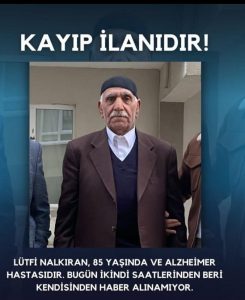 Erzurum’un Palandöken İlçesi Karayolları semtinde ikamet eden Lütfü Nalkıran (85) dün ikindi namazını kılmak için evinden Camiye gitti. Namazın ardından evine dönmeyen Nalkıran için ailesi Erzurum Emniyet Müdürlüğüne kayıp ilanı verdi. Alzeimer hastası olduğu belirtilen Nalkıran’ın evine dönmemesi aile bireylerini tedirgin etmeye başladı. Dün ikindi namazı ile birlikte haber alınamayan Nalkıran’ın arama seferberliği başlatıldı. Ailesi alzeimer hastası olan yaşlı adamı görenlerin en yakın polis merkezine bildirmelerini rica etti.