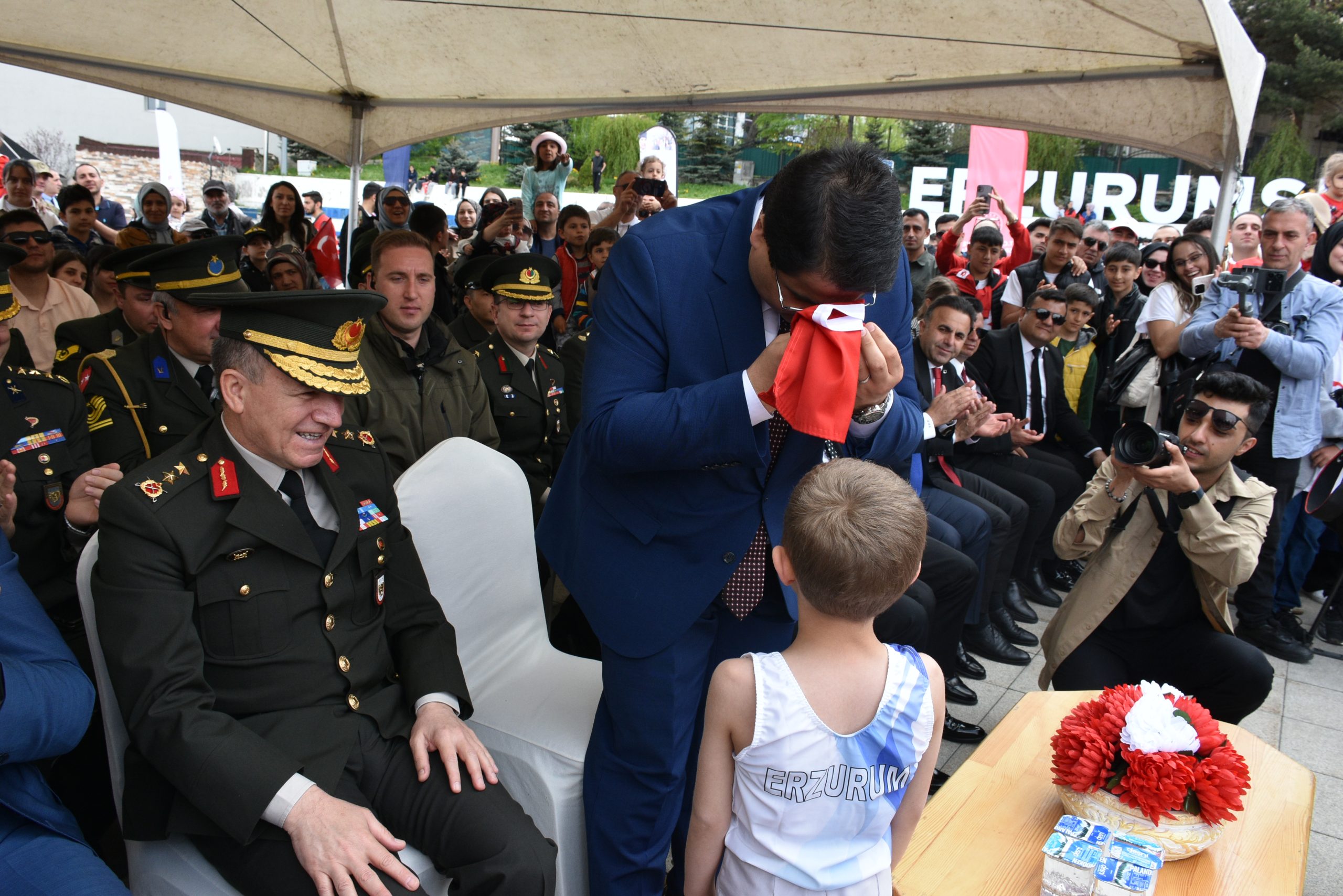 Küçük cimnatikçilerin en ensfes gösterinisinin ardından minik bir sporcu açtıkları Türk bayrağını öperek Vali Yardımcısı Ahmet Özdemir’e takdim etti. Özdemir de Ay-yıldızlı al bayrağımızı öperek teslim aldı.
