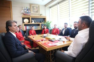 Türkiye Kadın A Milli Curling Takımı, Gençlik ve Spor Bakan Yardımcısı Hamza Yerlikaya’yı ziyaret etti. ‘Asrın Güreşçisi’ Yerlikaya ve Ay-yıldızlı kadın curlingçilerin buluşması oldukça samimi bir ortamda gerçekleşti. Türkiye Curling Federasyonu Başkanı Prof. Dr. Kenan Şebin, Genel Sekreter Yusuf Ayçiçek, Kadın A Milli Takım Antrenörü Bilal Ömer Çakır ile yardımcısı Ahmet Tunga’nın da yer aldığı ziyarette, Federasyon Başkanı Şebin, Gençlik ve Spor Bakan Yardımcısı Hamza Yerlikaya’ya Milli takım forması hediye etti,