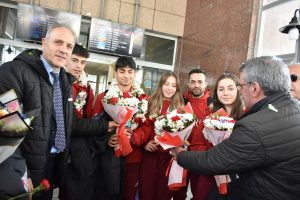 Gençlik ve Spor İl Müdürlüğü Spor Faaliyetleri Şube Müdürü Vahit Albayrak’ın yanı sıra Buz Pateni Federasyonu yönetim Kurulu üyeleri Özcan Işık, Naci Korucu, Köksal Kaçmaz, Zekeriya Deniz ile TOHM Müdürü Muzaffer Kaya sporculara çiçek sundu. Palkar Spor Kulübü Başkanı Arif Karadağ ile Short Track Milli Takımı Başantrenörü Artur Sultangaliyev de EYOF fatihlerini yalnız bırakmadı. Davul zurna ve çiçeklerle karşılanan Sürat Patenciler, havalimanında gurur anları yaşadı. Sporcuların aileleri ve short track sporcuları konfeti patlatarak EYOF fatihleri lehine tezahürat yaptı.