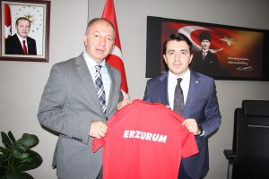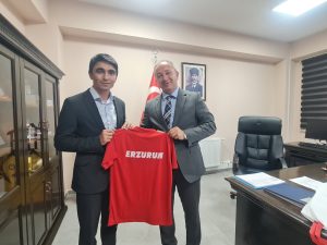 Tekman Kaymakamı Hüseyin Demirkol’a ‘hayırlı olsun’ dileklerini ileten Erzurum Gençlik ve Spor İl Müdürü Levent Çakmur, Kaymakam Demirkol’a ‘Erzurum’ yazılı forma hediye etti.