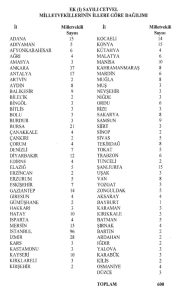 Adana 15, Adıyaman 5, Afyonkarahisar 6, Ağrı 4, Amasya 3, Ankara 37, Antalya 17, Artvin 2, Aydın 8, Balıkesir 9, Bilecik 2, Bingöl 3, Bitlis 3, Bolu 3, Burdur 3, Bursa 21, Çanakkale 4, Çankırı 2, Çorum 4, Denizli 7, Diyarbakır 12, Edirne 4, Elazığ 5, Erzincan 2, Erzurum 5, Eskişehir 7, Gaziantep 14, Giresun 4, Gümüşhane 2, Hakkari 3, Hatay 10, Isparta 4, Mersin 13, İstanbul 96, İzmir 28, Kars 3, Kastamonu 3, Kayseri 10, Kırklareli 3, Kırşehir 2, Kocaeli 14, Konya 15, Kütahya 4, Malatya 6, Manisa 10, Kahramanmaraş 8, Mardin 6, Muğla 8, Muş 3, Nevşehir 3, Niğde 3, Ordu 6, Rize 3, Sakarya 8, Samsun 9, Siirt 3, Sinop 2, Sivas 5, Tekirdağ 8, Tokat 5, Trabzon 6, Tunceli 2, Şanlıurfa 15, Uşak 3, Van 8, Yozgat 3, Zonguldak 5, Aksaray 4, Bayburt 1, Karaman 3, Kırıkkale 3, Batman 5, Şırnak 4, Bartın 2, Ardahan 2, Iğdır 2, Yalova 3, Karabük 3, Kilis 2, Osmaniye 4, Düzce 3