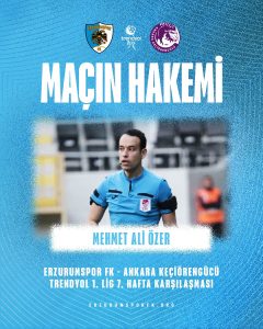 Kazım Karabekir Stadı’nda saat 17.00’da oynanacak olan Erzurumspor-Ankara Keçiörengücü maçını Mehmet Ali Özer yönetecek. Kendisine Emre Doğu ile Arif Dilmeç yardımcılık yapacak. Dördüncü hakem görevini Muhammed Selim Özbek üstlenecek. Bülent Birincioğlu VAR’da, Melis Özçiğdem AVAR’da görev yapacak.